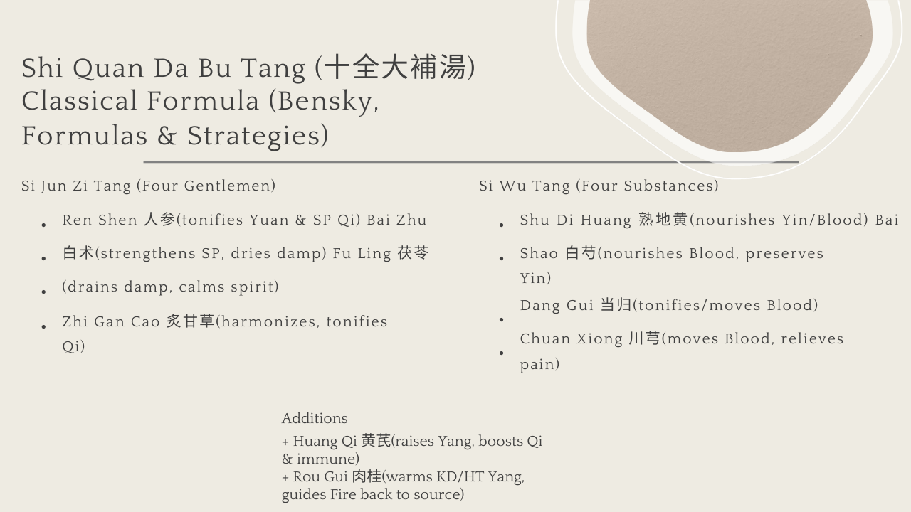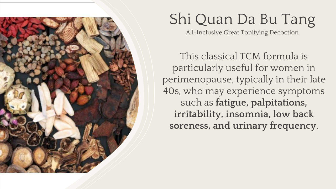 While the classic formula, Shi Quan Da Bu Tang , is particularly useful for women experiencing Qi and Blood deficiency during perimenopause. Modified versions can be even more helpful.