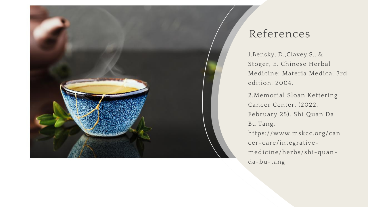 Shi Quan Da Bu Tang is often used in palliative care for severe chronic or incurable disorders, such as cancer. It has also been employed for appetite loss, anemia, dry skin or mouth, fatigue, and night sweats. Memorial Sloan Kettering has reported that “Shi Quan Da Bu Tang is an herbal formula that consists of 10 herbs: Panax ginseng (Ginseng), Angelica sinensis (Dong quai), Paeonia lactiflora (Peony), Atractylodes macrocephala (Atractylodes), Poria cocos (Hoelen), Cinnamomum cassia (Cinnamon), Astragalus membranaceus (Astragalus), Liqusticum wallichii (Cnidium), Glycyrrhiza uralensis (Licorice), and Rehmannia glutinosa (Rehmannia) (1). Also known as Juzen-taiho-to in Japan, it is used in traditional medicine to alleviate fatigue, anemia, appetite loss, dry or scaly skin, night sweats, and dry mouth, and to treat cancer. Supporters believe the formula’s beneficial effects are due to interactions between its components.
